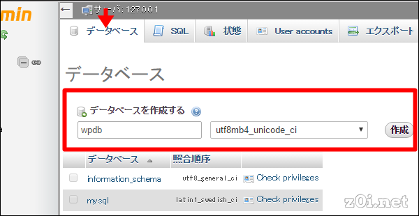 「wpdb」というデーターベースを作成します。