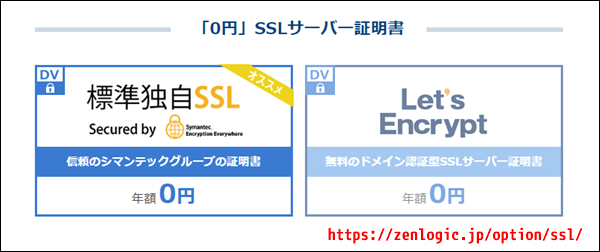 SSLが無料で使えるレンタルサーバーも増えてきましたが、Zenlogicの場合は「シマンテックグループ発行のDV証明書」が0円なのがよいと思います。無料SSLでは「Let's Encrypt」のところが多いですが、個人的にはなんとなく微妙かなぁと思ってたのですが、別の選択肢があるのなら0円で運用してもよいかなぁと思います。