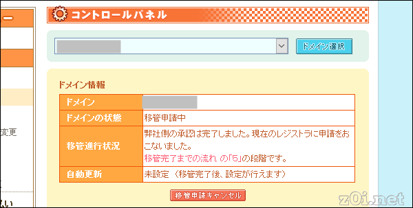私はドメインロックを外すのを忘れて移管申請してしまいました。こうなると、移管が失敗するまでどうすることもできないんですね。失敗してから再度、申請することになります。