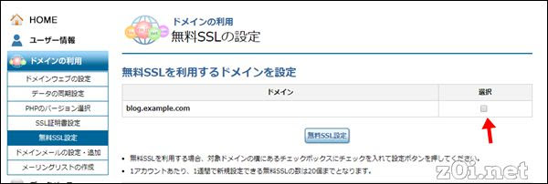 ドメインウェブの設定が済むと、無料SSL設定の一覧に出てくるので、SSL化したいものをチェックして「無料SSL設定」ボタンを押すだけです。