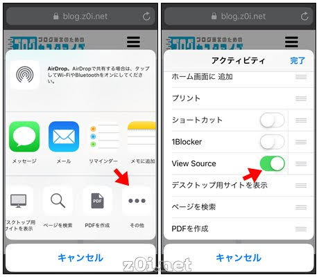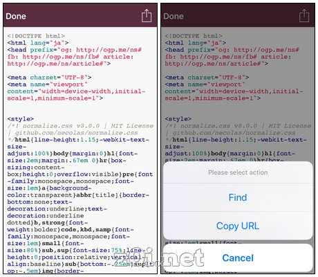Webページを表示させて、ブラウザの共有のところから、View Sourceのところをタップすると、HTMLソースが表示できます。